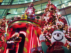 This festive scene greets shoppers of Market, Market!, a mall in Global City, Taguig. The larger than life toy soldier, gifts, snowmen, Christmas trees with candy cane ornaments and colorful lights amaze children of all ages.